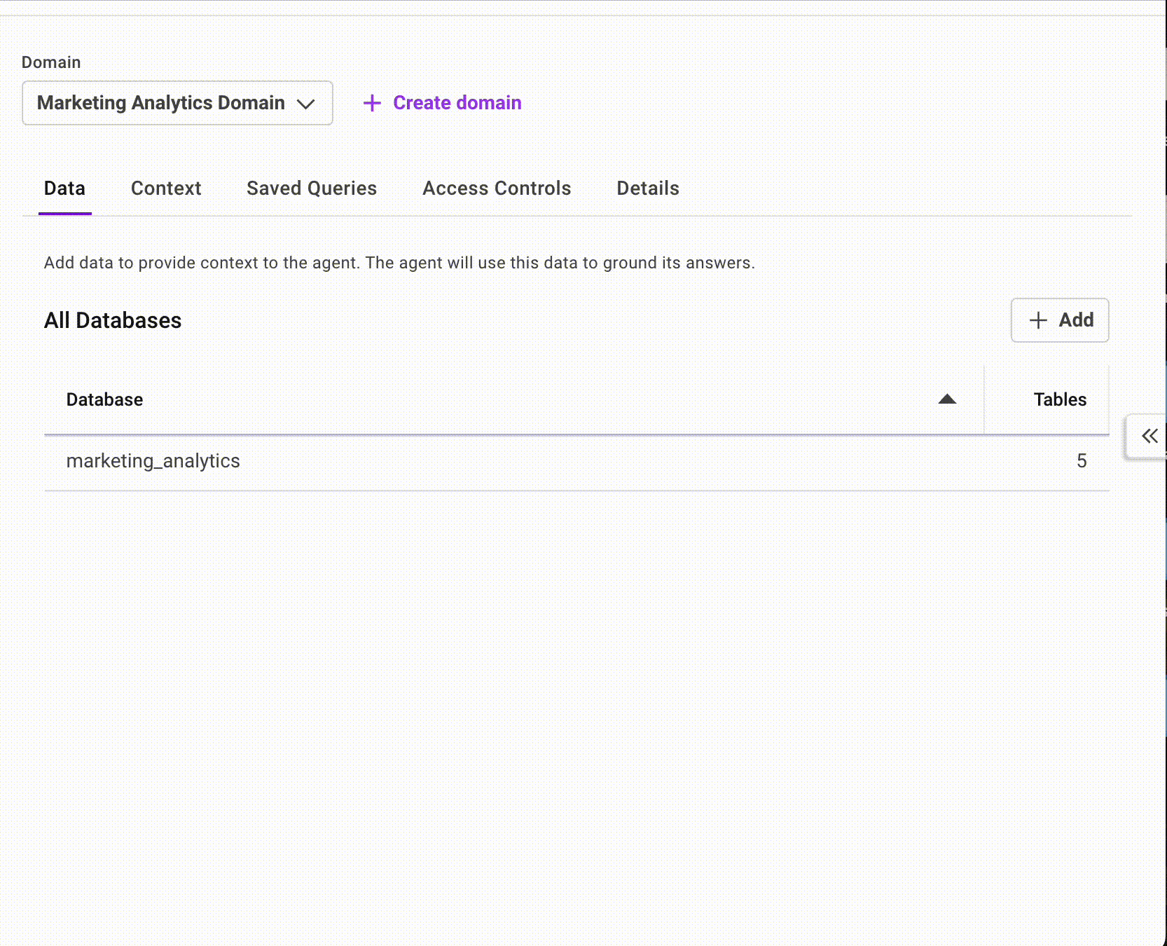 Users with the “Agent Domain Owner” permission can configure Domains by selecting relevant workspaces, databases, and tables.