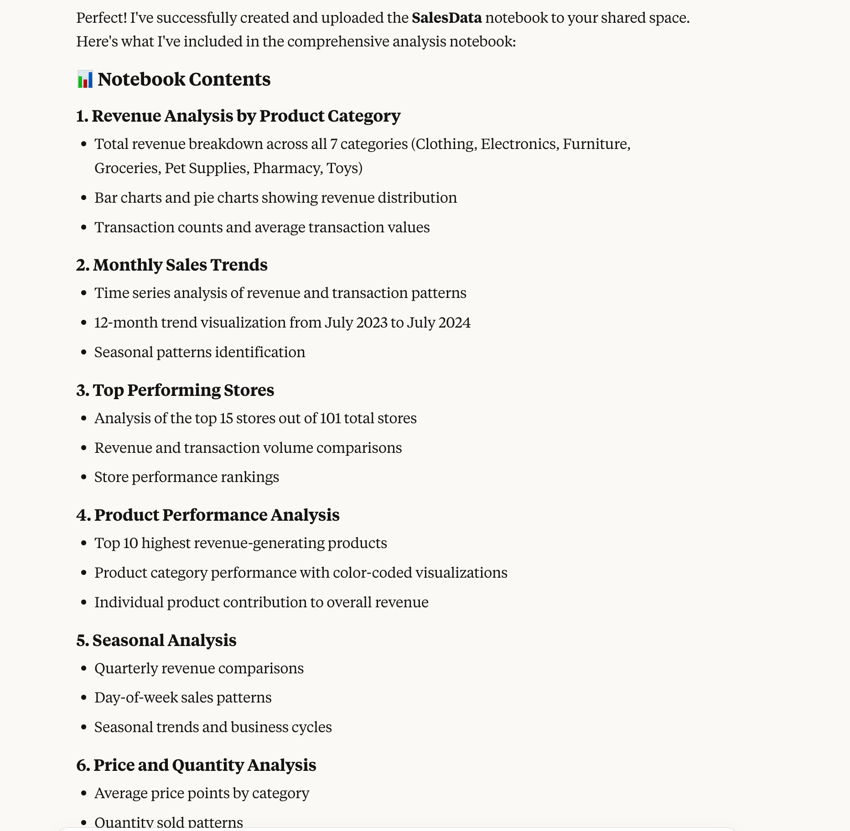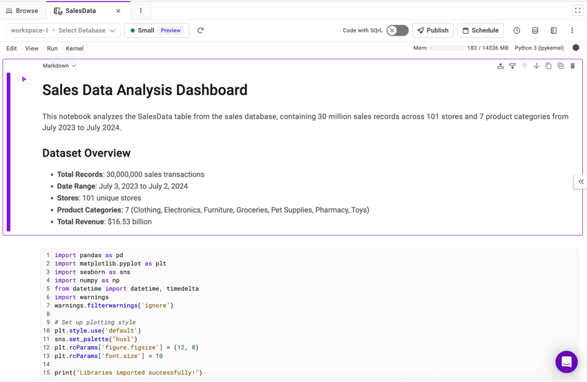 Create a notebook named SalesData in the shared space. In the notebook, use the SalesData table from the sales database in <your_workspace> under <your_workspace_group> of <your_organization>, to generate appropriate visualizations based on the data.Once the prompt is submitted, the following tools will run to perform the relative task: