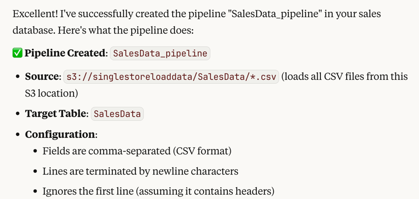 Create a pipeline SalesData_pipeline using 's3://singlestoreloaddata/SalesData/*.csv'