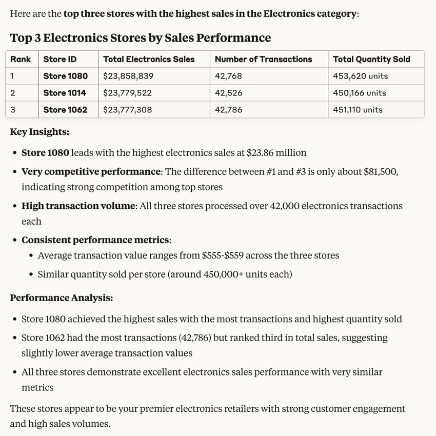 run_: Queries thesql SalesDatatable to find the top three stores with the highest sales in the Electronics category.
