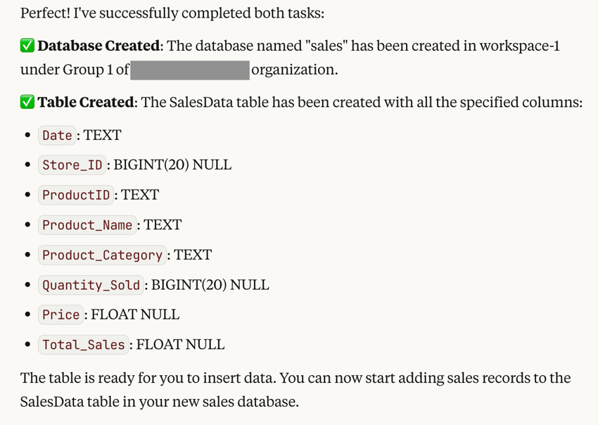Create a new database named sales in <your_workspace> under <your_workspace_group> of <your_organization>, and then create a table called SalesData with the following columns:- Date: Text- Store_ID: Big integer (20), nullable- ProductID: Text- Product_Name: Text,- Product_Category: Text- Quantity_Sold: Big integer (20), nullable- Price: Float, nullable- Total_Sales: Float, nullable