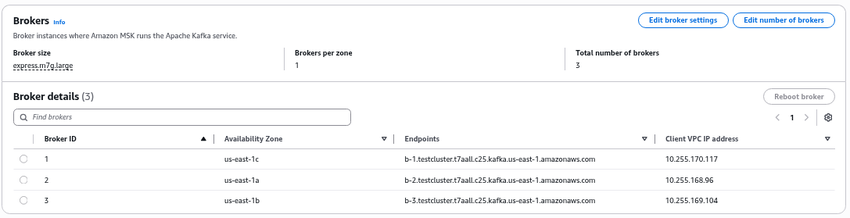 Each broker’s hostname is mapped to the correct NLB listener port (e.