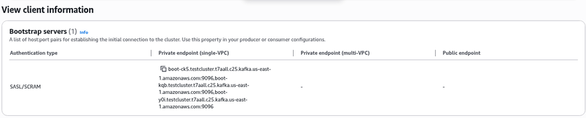 Get the SASL/SCRAM endpoints from the Kafka cluster summary in View Client Information.