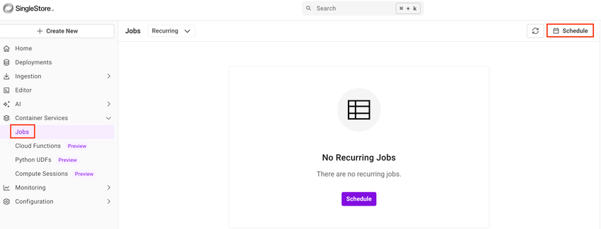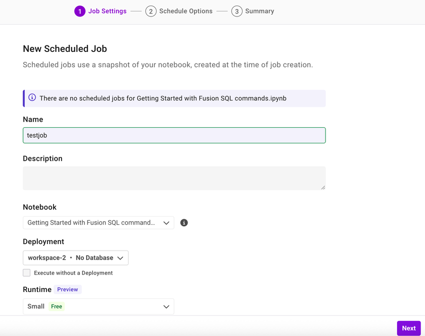 Selecting a workspace allows you to connect to your SingleStore databases referenced in the notebook natively. You can also run a scheduled job without a deployment attached to it.