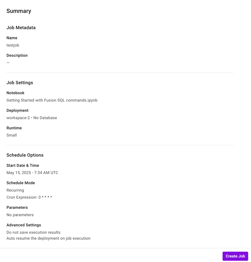 A scheduled execution of a notebook is referred to as a Job. The SingleStore Job service enables you to schedule jobs according to your requirements and supports cron expressions, providing a flexible and powerful way of defining job schedules. Cron-based scheduling uses the standard cron syntax, providing precise control over when workloads are run. It supports the format - minute hour day month weekday, and allows for complex scheduling patterns (e.g., running jobs at 8:00 AM every Monday). You can create, edit, and delete cron schedules, and validate cron expressions in real-time.