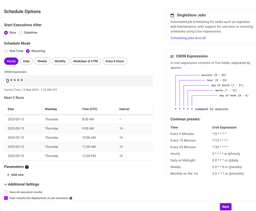 The following examples demonstrate how maximum allowed execution duration, minimum execution interval, and maximum execution interval are used while creating a scheduled job and how those patterns apply to scheduling notebooks within the SingleStore job service.