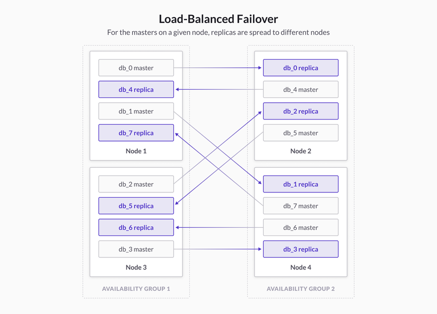 If Node 1 fails in this setup, SingleStore promotes the replica of db_0 on Node 2 to primary and the replica of db_1 on Node 4 to primary.