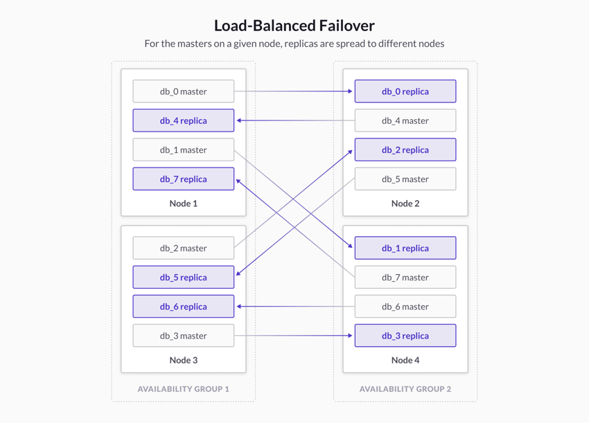 The primary partitions are distributed evenly on nodes across the workspace. The primary partitions on every node in an availability group have their replicas spread evenly among a set of nodes in the opposite availability group. The even distribution of replicas ensures that a failover distributes the additional load from the node failure uniformly across the workspace. As read queries are sent to the primary partitions, balanced load distribution prevents the overloading of a single node with the newly promoted primary partitions.