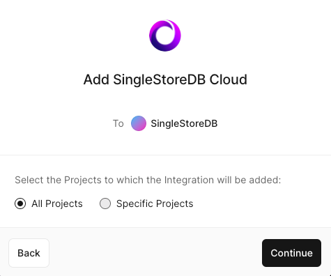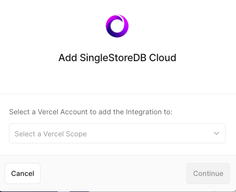 On the Add SingleStoreDB Cloud dialog, select your Vercel account in which to add the integration, and then select Continue.