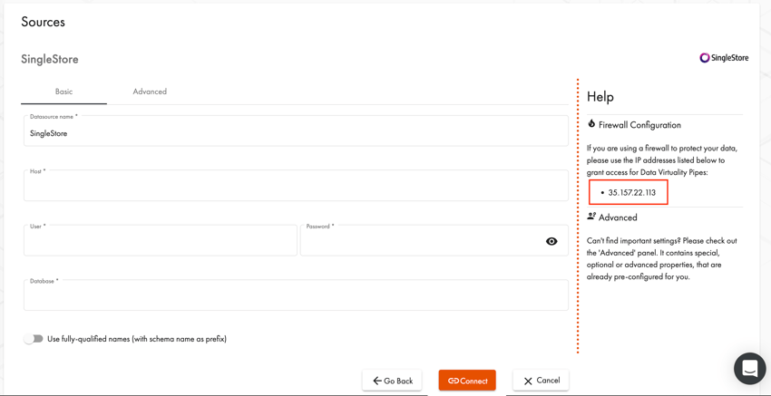 You can find the Data Virtuality Pipes IP address on the SingleStore source screen, in the Help pane, under Firewall Configuration.