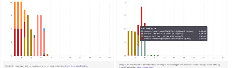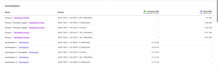 For the workspace group, Group 1 - Primary Region (AWS TIER 1: US WEST 2 (OREGON)), the data storage graph shows: