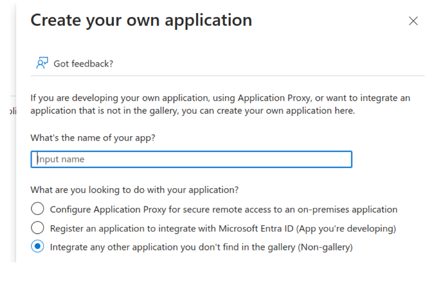 If you do not have an existing enterprise application, then create it by clicking on Create your own application, Non-Gallery.