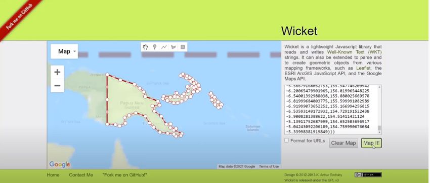 MULTIPOLYGONas separatePOLYGONs by using the Wicket library website.After navigating to the website, copy the MULTIPOLYGONset from the CSV file and paste it to the Wicket box.Click Map It: In this example, the map displays the country Fijiwith three polygons.