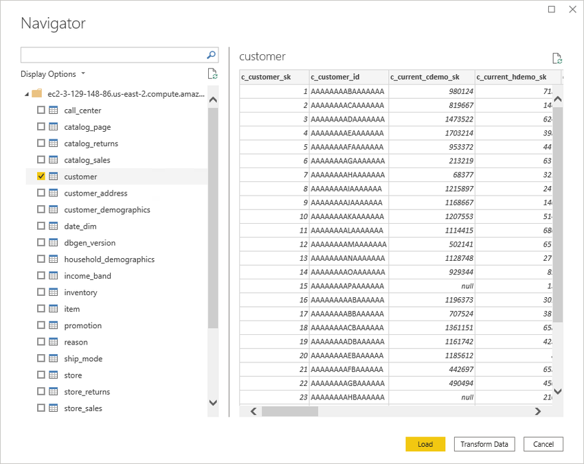 After authentication, select the tables to import in the Navigator dialog, and then select the Load button.