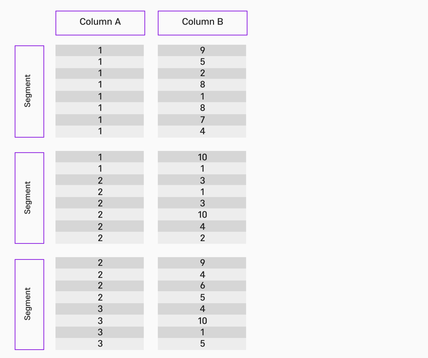The figure below shows how the data is stored with the multi-column sort key.A and B, and the segment size is 10, the first three columnstore segments would look as follows.A, and then secondarily on the values in column B.
