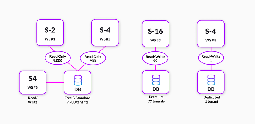 Here, a tenant_id-column approach would be used throughout, so 9,000 tenants in the "Free" group could fit on one S2 workspace. The same approach would be used for the higher-level groups so the application code would only have to be written once and not be different for different tiers.