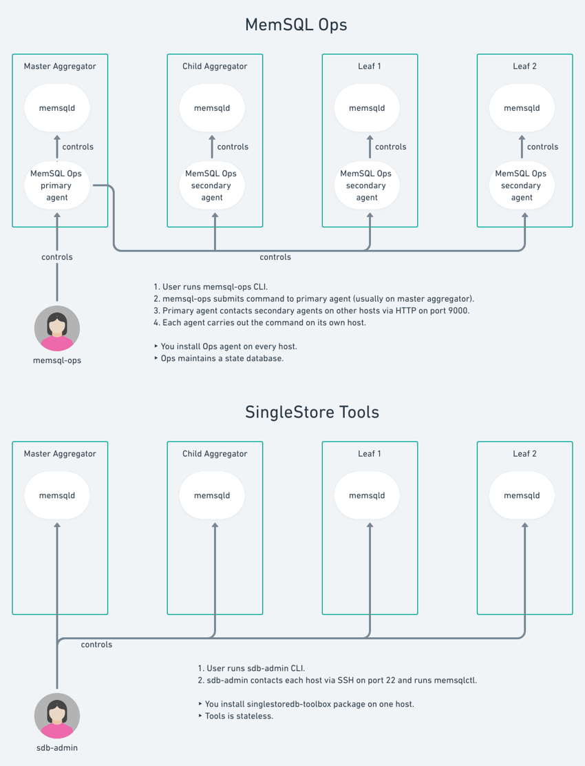 The difference in the mechanism between SingleStore Tools and MemSQL Ops is depicted in the following diagram.