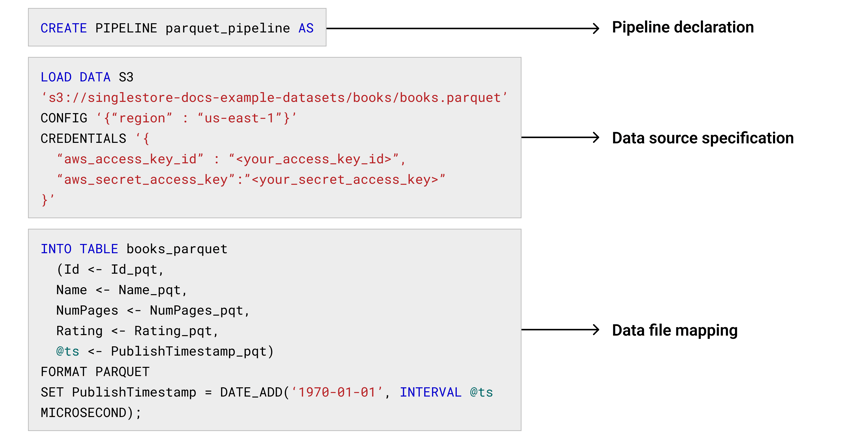 The following pipeline loads a Parquet file from Amazon S3.