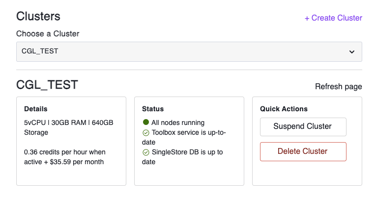 Suspends a cluster. When a cluster is suspended, the cluster name and connection endpoint are preserved, but the cluster does not process queries or consume credits. |