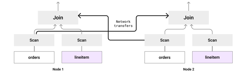 The image below illustrates the execution of this query. Since order_key (the JOIN column) is not the shard key for the orders table, rows from orders need to be transferred between nodes so that all rows from orders with a particular value of order_key are on the same node as with rows from lineitem that have that same value of order_key.