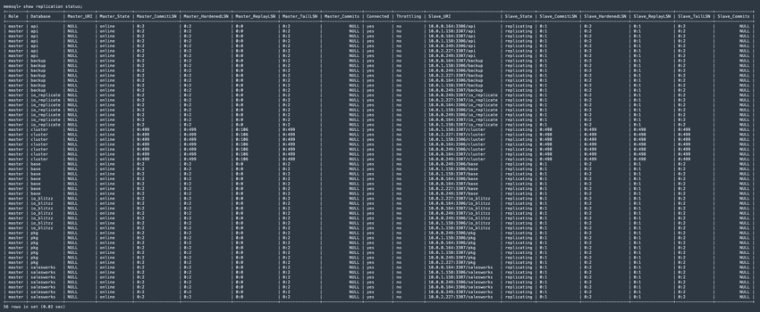 However, if you have a cluster with 32 or more leaves, then all leaves are not displayed when you run SHOW REPLICATION STATUS on the master aggregator.  This is because a distribution tree comes into play resulting in the display of only one entry per database.