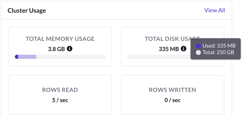Under Cluster Usage, Total Memory Usage accounts for cluster activities such as querying and logs, in addition to data storage.