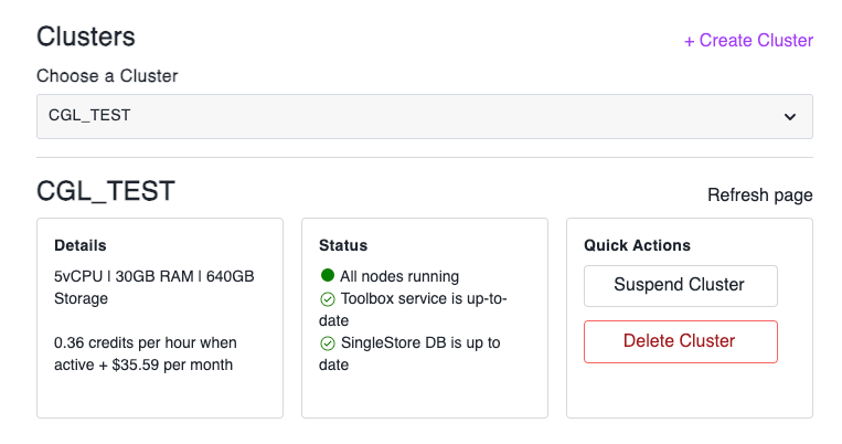 The selected cluster's status is displayed in the SingleStore app and in the main dashboard when SingleStore Studio first opens. |