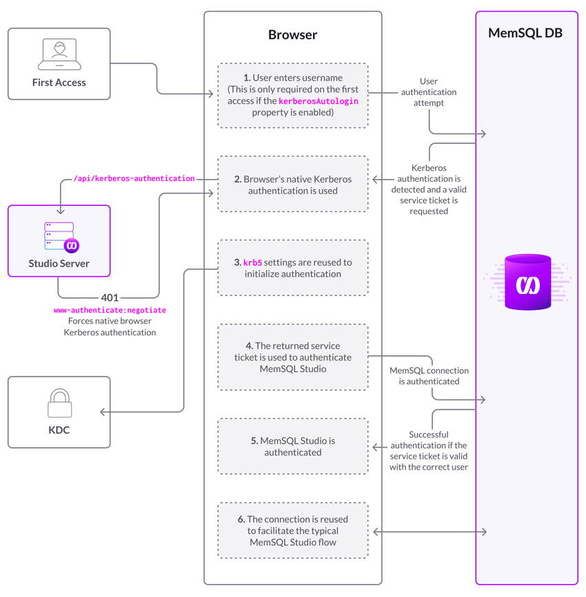 The Kerberos authentication flow is depicted in the following diagram.